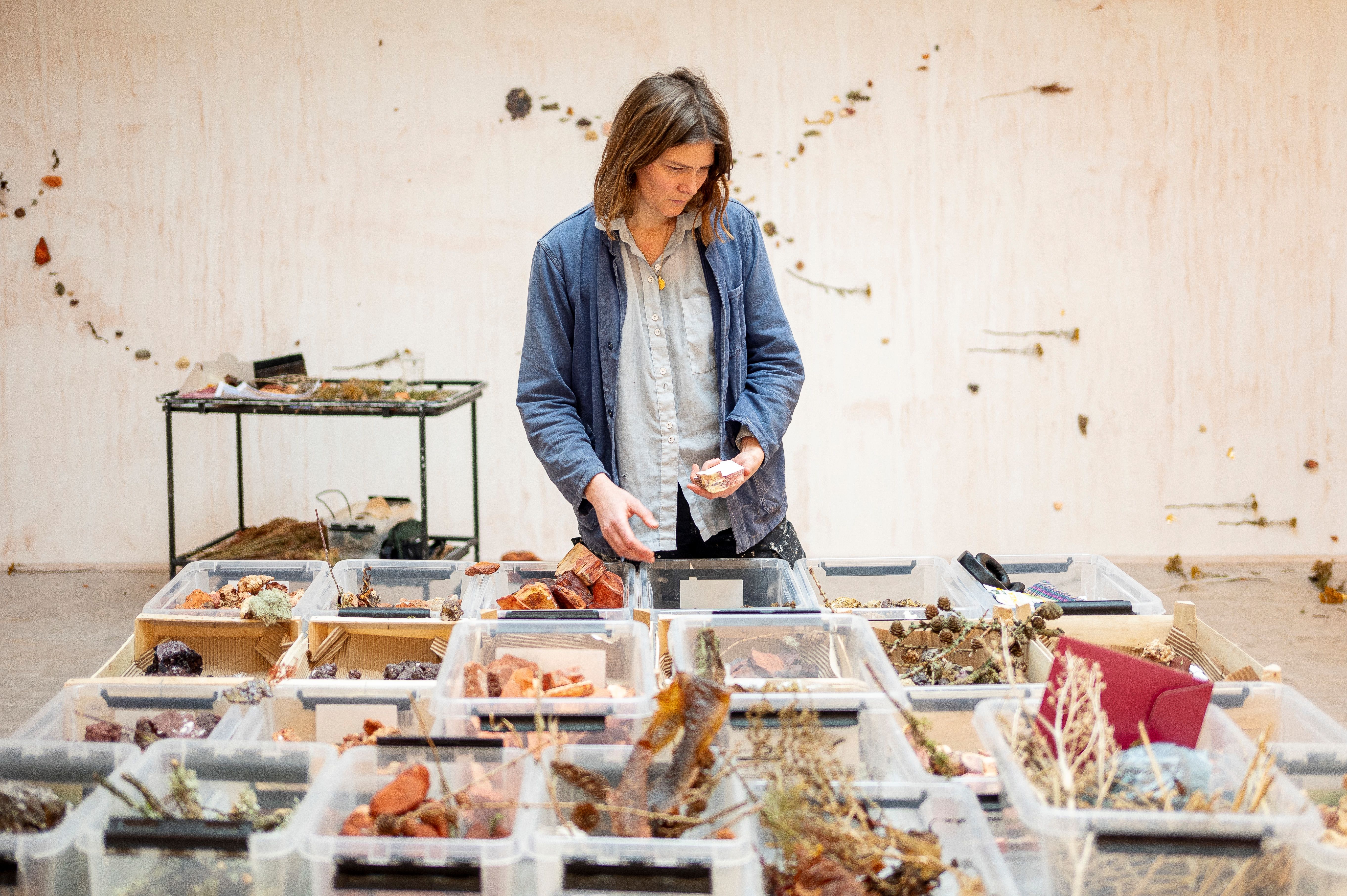 Gerahmt durch duftende Guckkästen mit Sound, Fotografien und Malereien werden Vogelfedern, Würmer und Falter neben Skulpturen aus Naturstein und algengefüllten PET-Flaschen konzeptionell zu Hauptdarstellern.