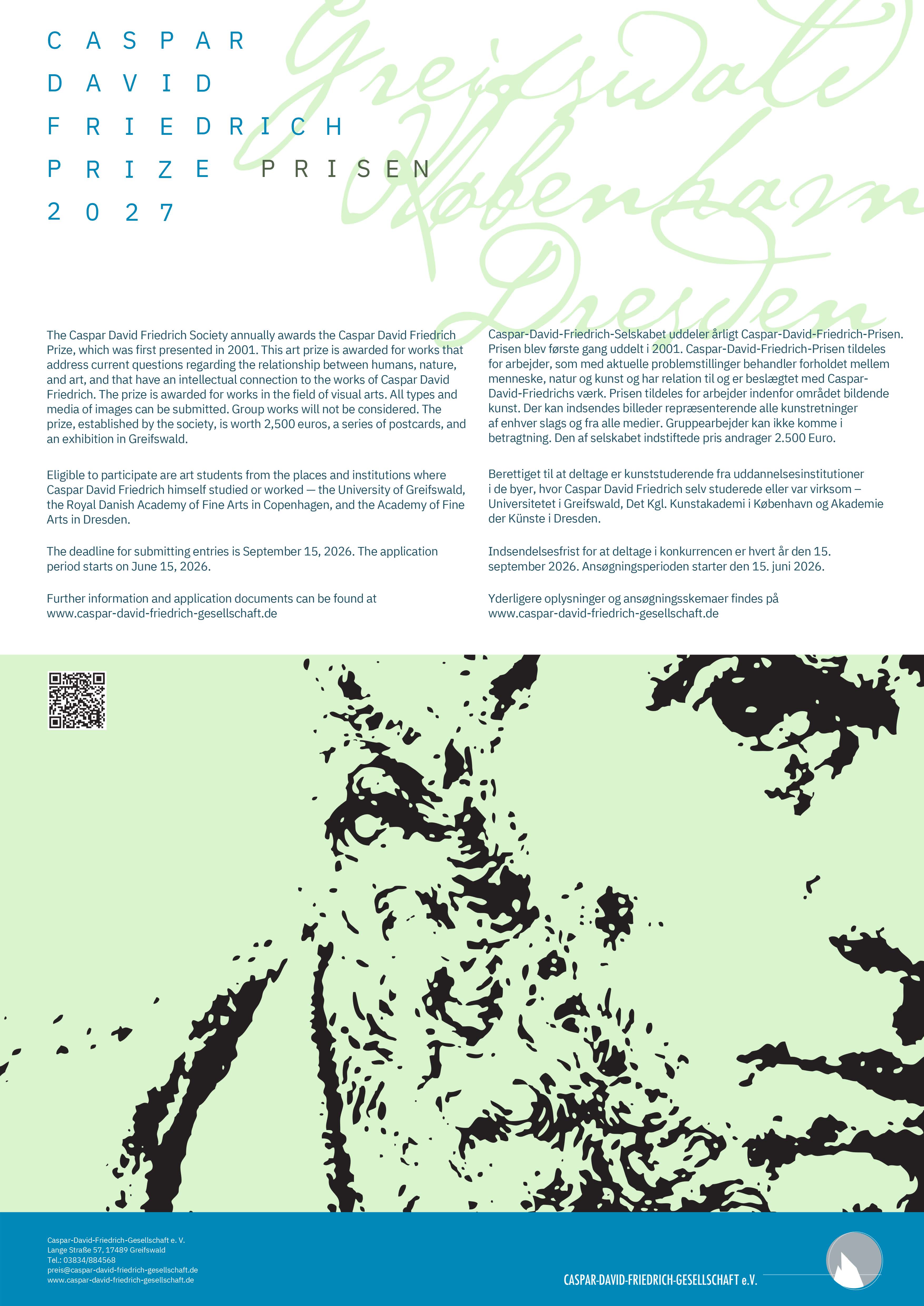 Applications are invited from art students who have not yet completed their training and who are studying in those places and institutions where Friedrich himself lived, studied and worked – Greifswald, Copenhagen and Dresden.