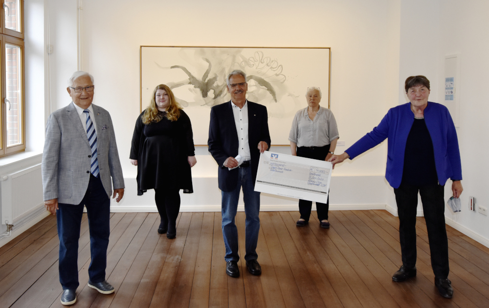 Mitglieder der Caspar-David-Friedrich-Gesellschaft e.V. nehmen die großzügige Spende des Rotary Clubs Greifswald-Caspar David Friedrich entgegen. V.l.n.r.: Günter Pust (Club-Meister des Rotary Clubs Greifswald-Caspar David Friedrich), Caroline Barth (Geschäftsführende Leiterin des Caspar-David-Friedrich-Zentrums), Christian Subklew (Präsident des Rotary Clubs Greifswald-Caspar David Friedrich), Barbara Resch (Schatzmeisterin der Caspar-David-Friedrich-Gesellschaft e.V.) und Hannelore Kohl (Vorstandsvorsitzende der Caspar-David-Friedrich-Gesellschaft e.V.)